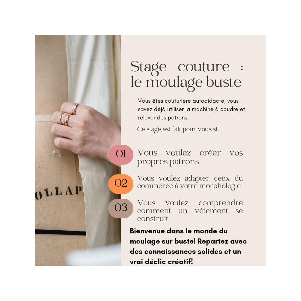 - **Perfectionnez votre technique** : Apprenez à maîtriser l'art du moulage, une compétence clé pour toute création de vêtements sur mesure.