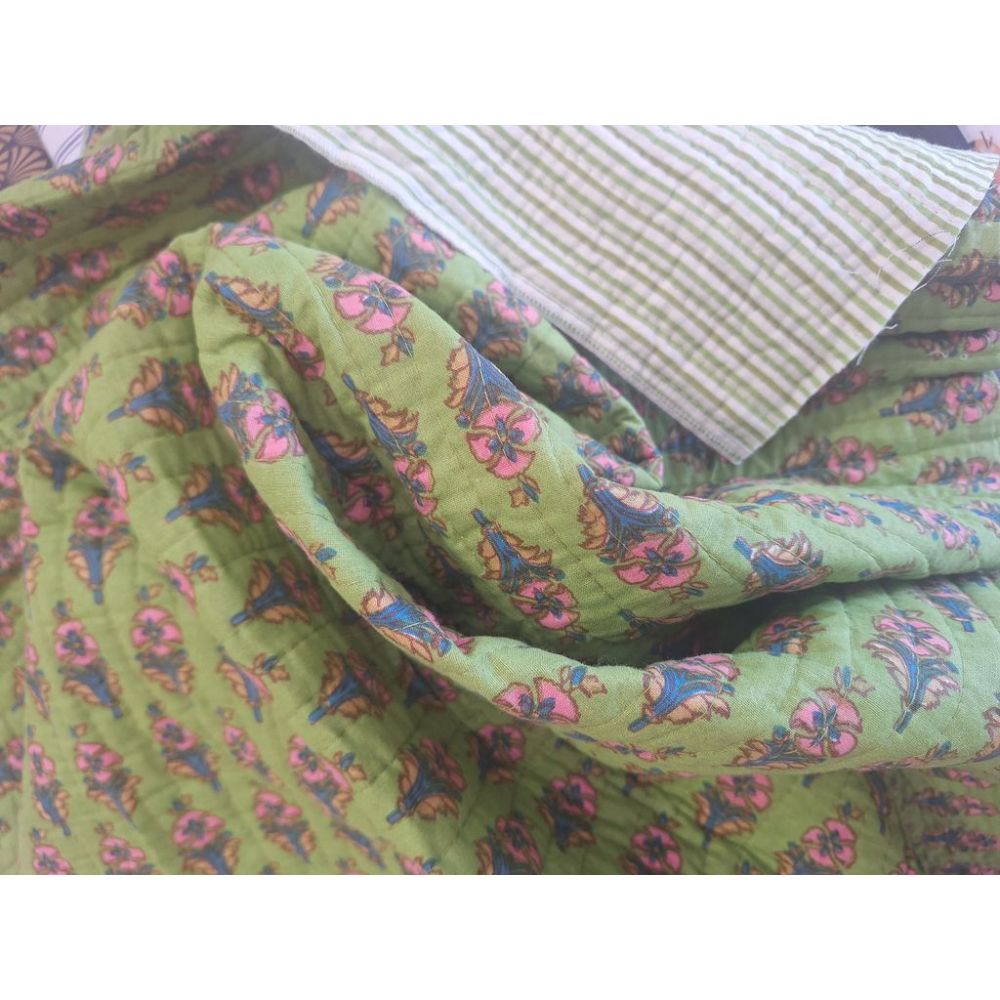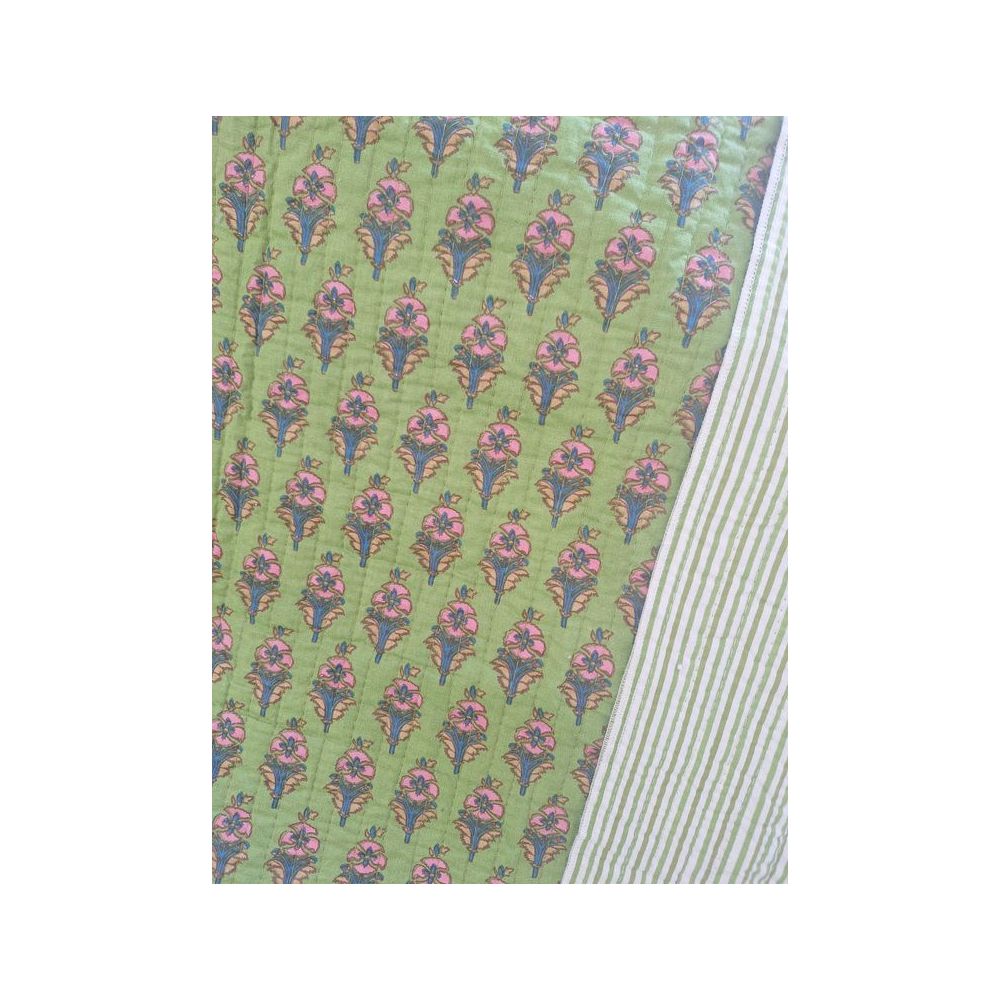 Le fond vert met en valeur un motif végétal stylisé aux accents traditionnels, évoquant les imprimés artisanaux indiens.